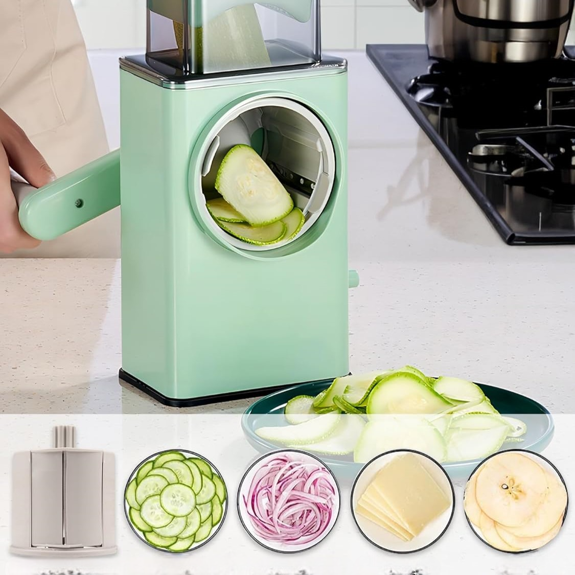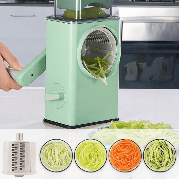 Представяме ви многофункционалния уред за рязане на зеленчуци – незаменим помощник във всяка кухня, който ще ви спести време, усилия и излишен стрес при приготвяне на храна. Благодарение на подменяемите остриета, можете да нарежете зеленчуци и други продукти във всякакви форми – бързо, лесно и прецизно. Идеален за краставици, домати, картофи, моркови, лук, чесън, сирене, ядки и още много.