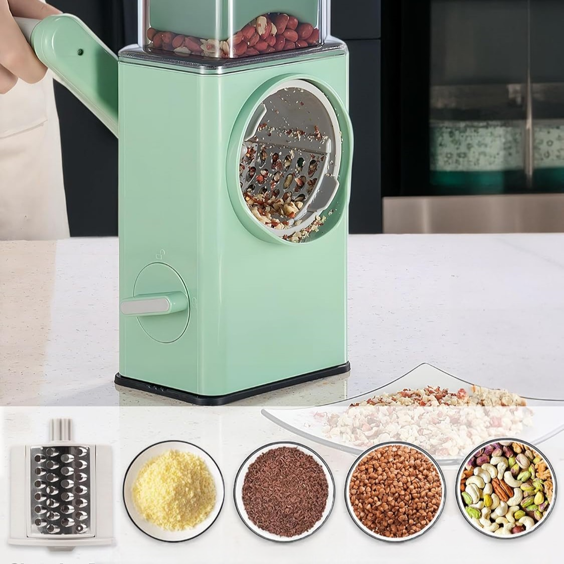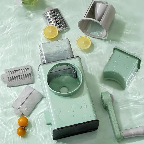Със своя усъвършенстван въртящ се механизъм и ергономична дръжка, уредът работи с до 15 пъти по-голяма скорост от обикновените рендета. Просто завъртете и ще получите перфектно нарязани съставки за секунди. Безопасността е на първо място – ръцете ви остават далеч от остриетата, а продуктите се поставят директно, без нужда от предварително рязане.