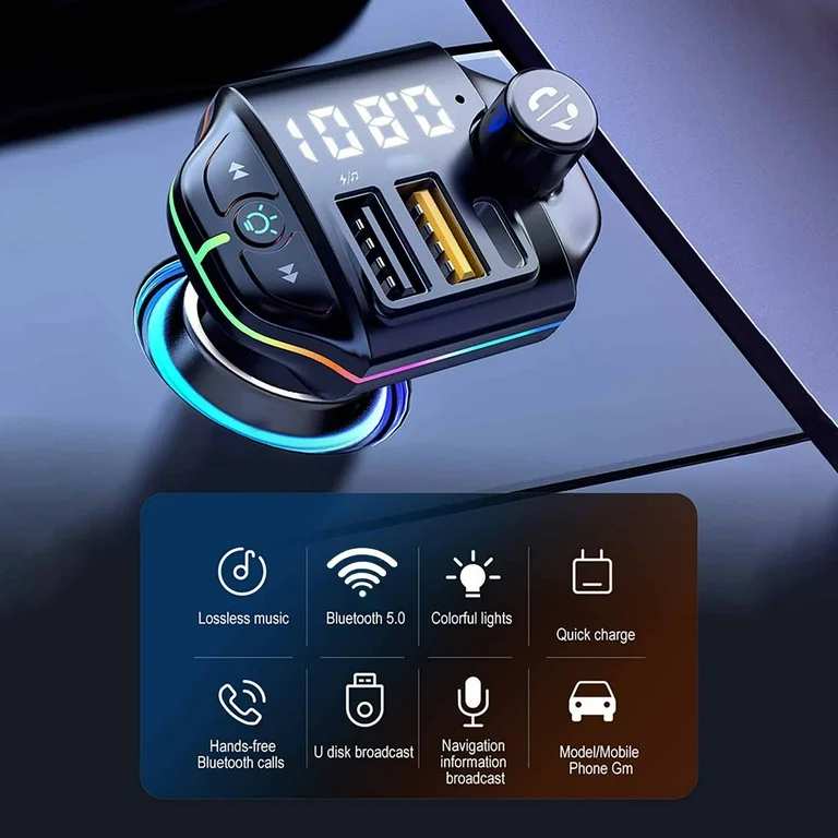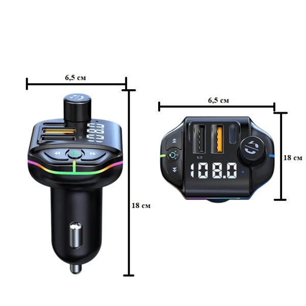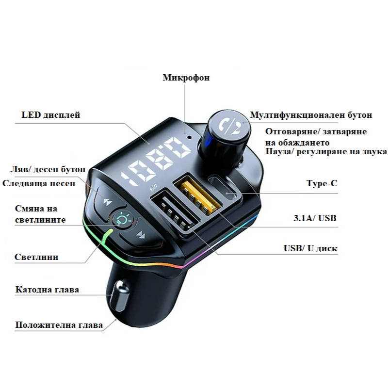 Направете всяко пътуване по-приятно с любимата си музика и усетете свободата на безжичното забавление с Bluetooth FM предавателя ZTB-A10. Слушайте FM радио, стриймвайте песни директно от вашия смартфон чрез Bluetooth или възпроизвеждайте музика от USB флашка, като всичко това е съчетано с кристално чист звук и удобство. Вграденият микрофон ви позволява да приемате повиквания с едно докосване, осигурявайки безопасност и комфорт по време на шофиране. ZTB-A10 е много повече от обикновен FM предавател – той е и мощно зарядно с три изхода, включително USB Type-C PD, USB-A QC3.0 и стандартен USB-A порт. Благодарение на поддръжката на Power Delivery и QuickCharge 3.0 протоколи, можете да зареждате своя смартфон, таблет, GPS навигация и други устройства бързо и ефективно, дори докато сте в движение. Дисплеят със стилен цифров LED екран, а цветните RGB светлинни ефекти създават модерна атмосфера в интериора на автомобила ви. Поддържащ Bluetooth 5.0, ZTB-A10 е съвместим с почти всички съвременни устройства, осигурявайки стабилна връзка и безупречно качество на звука. Изберете Bluetooth FM трансмитера ZTB-A10 и превърнете всяко пътуване в истинско музикално преживяване с мощност, стил и свобода на върха на пръстите ви!