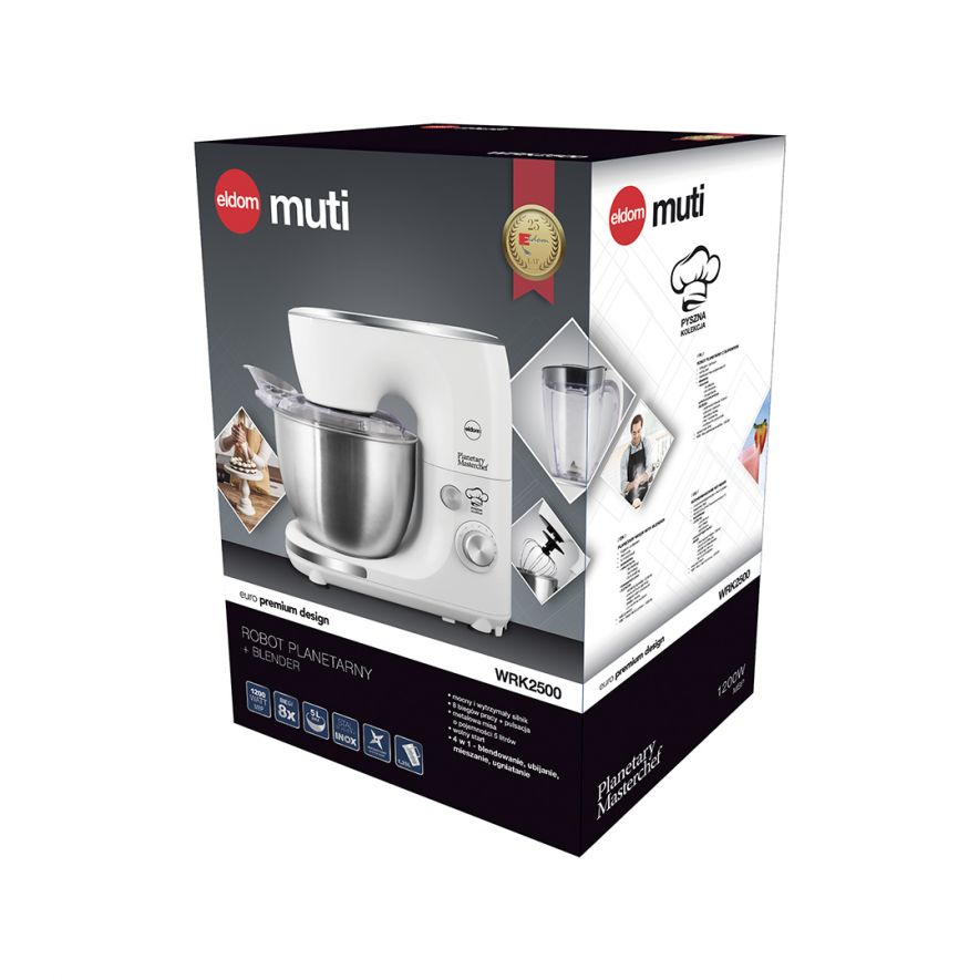 Издигнете кулинарните си умения на ново ниво с белия планетарен робот-блендер на ELDOM, който надминава всички очаквания! Забравете за стандартните 2-в-1 или 3-в-1 решения – този иновативен робот предлага истинско 4-в-1 изживяване: разбиване, смесване, месене и дори блендиране. Оборудван с 8 скорости и пулсиращ режим, той предлага максимална прецизност и контрол при всяка задача. Сменяемите приставки за месене, смесване и разбиване ви гарантират перфектни резултати, а интегрираният блендер с капацитет от 1250mL и мерителна капачка добавя допълнително удобство. Просторната 5-литрова купа от висококачествена неръждаема стомана INOX ви позволява да се справите с големи количества съставки, спестявайки време и усилия. Но това не е всичко – той съчетава елегантен дизайн, издръжливост и иновация. Разполага с мощен 600W мотор и 4-раменен нож на блендера, който дори може да натрошава лед. Лесен за употреба и почистване, той е създаден да ви осигури комфорт и удоволствие във всяка стъпка от готвенето. С белия планетарен робот-блендер на ELDOM всяка задача става по-бърза, всяко ястие – по-вкусно, и всяка рецепта – по-лесна за изпълнение!
