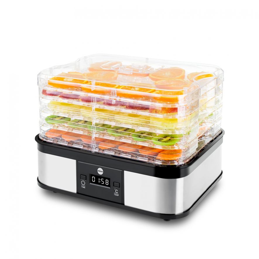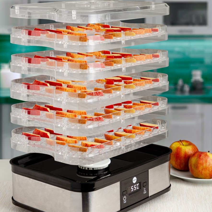 Насладете се на удоволствието от приготвянето на домашен чипс от ябълки, моркови или банани, сушено телешко, риба или ароматни подправки от пресни билки. Този дехидратор е вашият перфектен помощник за създаване на вкусна и здравословна храна у дома. С петте регулируеми тави можете лесно да изсушите различни видове храни – от плодове и зеленчуци до месо, риба, паста и подправки. Регулируемата височина на тавите позволява сушене на по-големи продукти, а прозрачният корпус ви дава възможност да наблюдавате процеса в реално време. Дехидраторът е оборудван с интуитивен LED дисплей, а заедно с компактният му дизайн и лесната поддръжка го правят идеален за всяка кухня. Създайте натурални вкусотии с минимални усилия – с дехидратора за храна на Eldom здравословното хранене никога не е било по-достъпно!