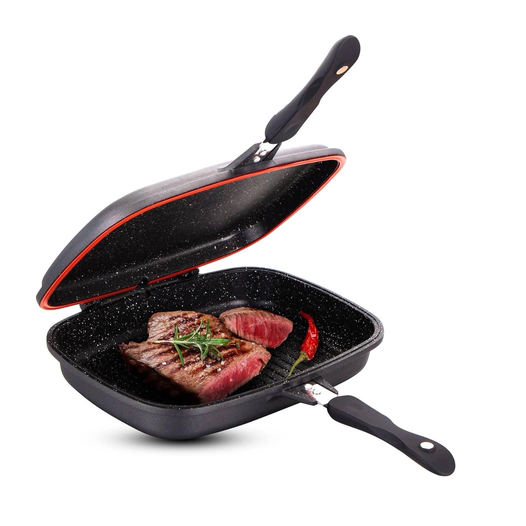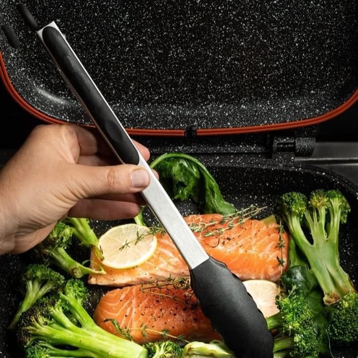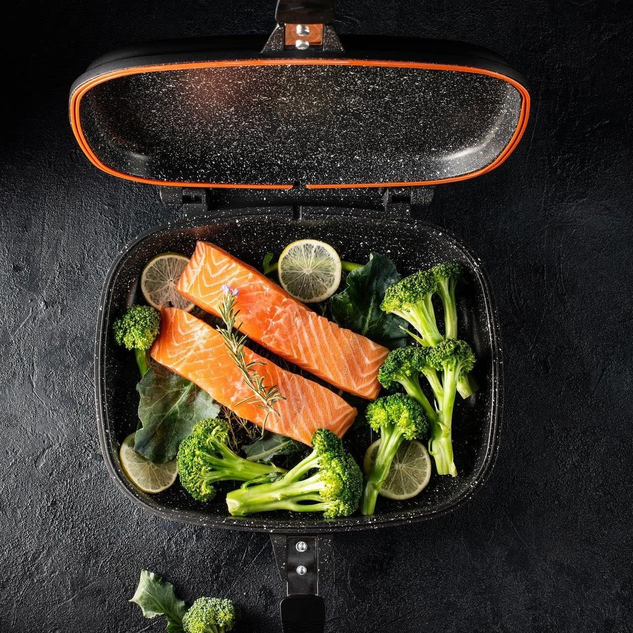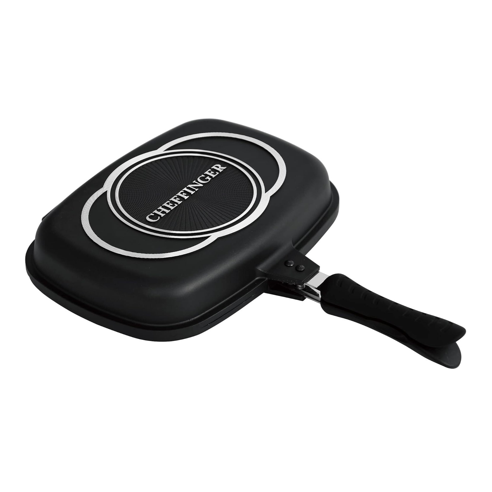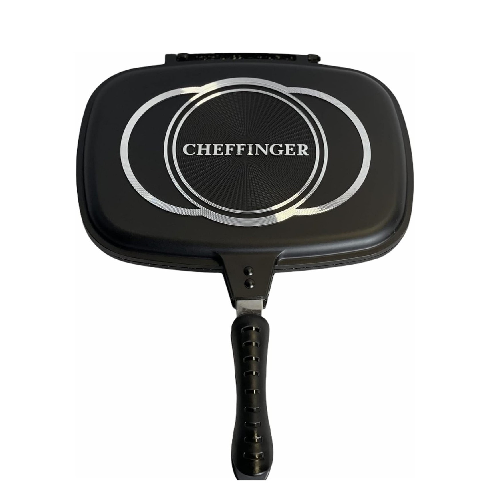 Открийте удобството и удоволствието от готвенето с новия двустранен грил тиган с мраморно покритие Cheffinger. Създаден да бъде верен помощник в кухнята, този стилен и функционален тиган ще ви спести време, усилия и мазнини. Благодарение на висококачественото незалепващо мраморно покритие, ще приготвяте любимите си ястия без загаряне и без нужда от излишно олио. Всичко става по-лесно – от хрупкави зеленчуци до сочни пържоли, без компромис с вкуса и качеството. Изработен от здрав лят алуминий и неръждаема стомана, тиганът осигурява равномерно разпределение на топлината и устойчивост при ежедневна употреба. Ергономичните топлоустойчиви дръжки осигуряват сигурен и комфортен захват, а силиконовото уплътнение с заключваща система ви гарантира чисто и безопасно готвене – без разливане, без пръски, без бъркотия. Подходящ е за различни видове котлони – електрически, газови и стъклокерамични. Двустранният му дизайн ви позволява лесно да обръщате храната за равномерно изпичане от двете страни – идеален е за гриловане, пържене и дори за готвене на пара. След като приключите с готвенето, няма нужда да търкате – благодарение на антибактериалното покритие и съвместимостта със съдомиялна, почистването е бързо и без усилие. А елегантният му черен дизайн с мраморно покритие го прави стилен акцент във всяка кухня. Това не е просто тиган – той е практично решение за модерното домакинство.
