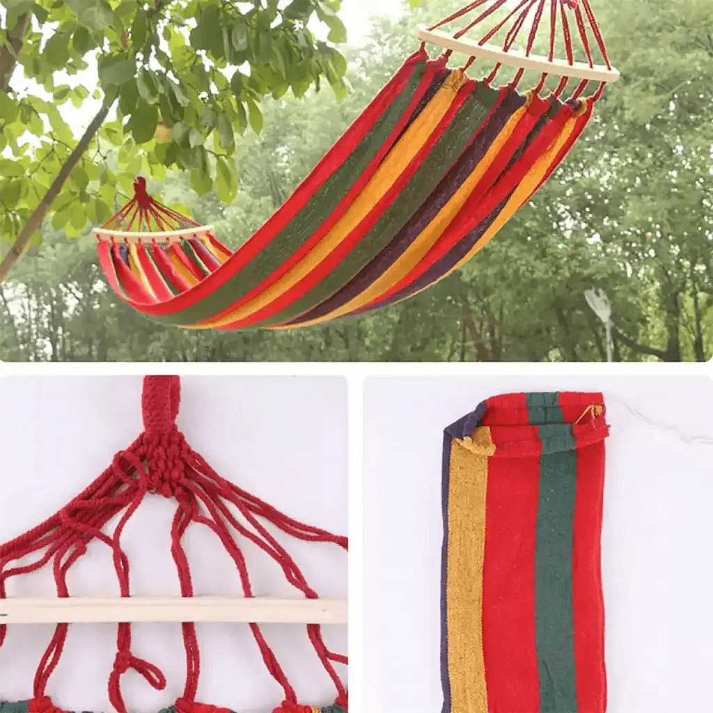 Превърнете градината си в оазис на спокойствие с нашия луксозен хамак, който добавя уют и стил към вашето външно пространство – градина, тераса или балкон. Изработен от висококачествен памук с плетка „рибешко око“, хамакът осигурява здравина и мекота, като позволява на кожата да диша и предоставя комфорт дори в най-топлите дни. Живите цветове в червено, оранжево и жълто създават топла атмосфера, а дървените пръти гарантират стабилност и лекота при употреба. Издръжливите материали го правят подходящ за всякакви метеорологични условия, а лесният монтаж с включените въжета ви позволява да го използвате веднага. Насладете се на спокоен момент с книга или споделено време с любим човек. Този хамак е перфектното допълнение за вашия дом, съчетавайки практичност и естетика за максимална наслада и релакс!