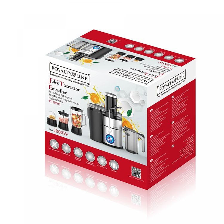 ROYALTY LINE сокоизстисквачка 4в1 е перфектният избор за вашата кухня, съчетавайки четири функции в едно – сокоизстисквачка, блендер, резачка и мелничка. С мощния си 1000W мотор и компактния дизайн, този уред е идеален както за ежедневна употреба, така и за специални поводи. Подходящ за приготвяне на свежи сокове, смутита, нарязани зеленчуци и смлени подправки или кафе, той улеснява всяка стъпка в кухнята. Изработен от висококачествени материали като неръждаема стомана и стъкло, уредът гарантира дълготрайност и лесна поддръжка. Всички разглобяеми части са подходящи за съдомиялна машина, а защитният механизъм осигурява безопасност при употреба. С елегантния си сребристо-черен дизайн, този уред не само е функционален, но и стилен акцент във вашата кухня. Той ще превърне ежедневните задачи в удоволствие и ще ви вдъхнови да се храните вкусно и здравословно.